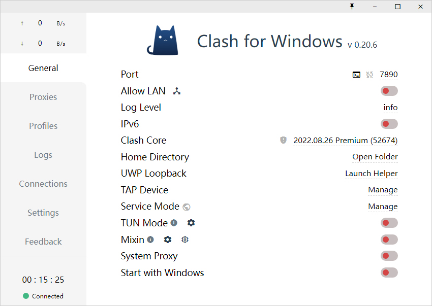 设置代理:进入 General 界面,选择 System Proxy 即可启动代理。其中 Start With Windows 代表是否开机后自动运行。