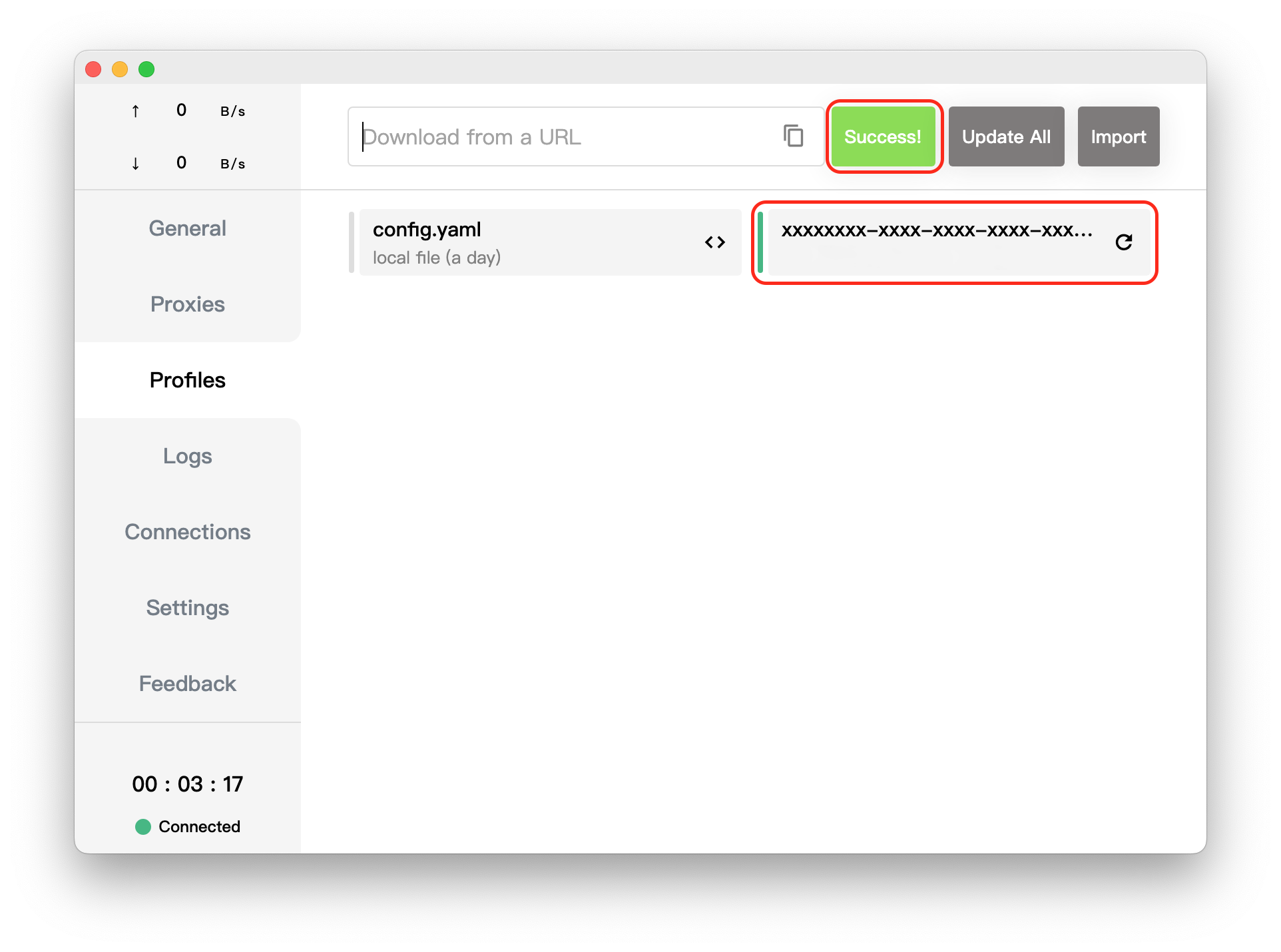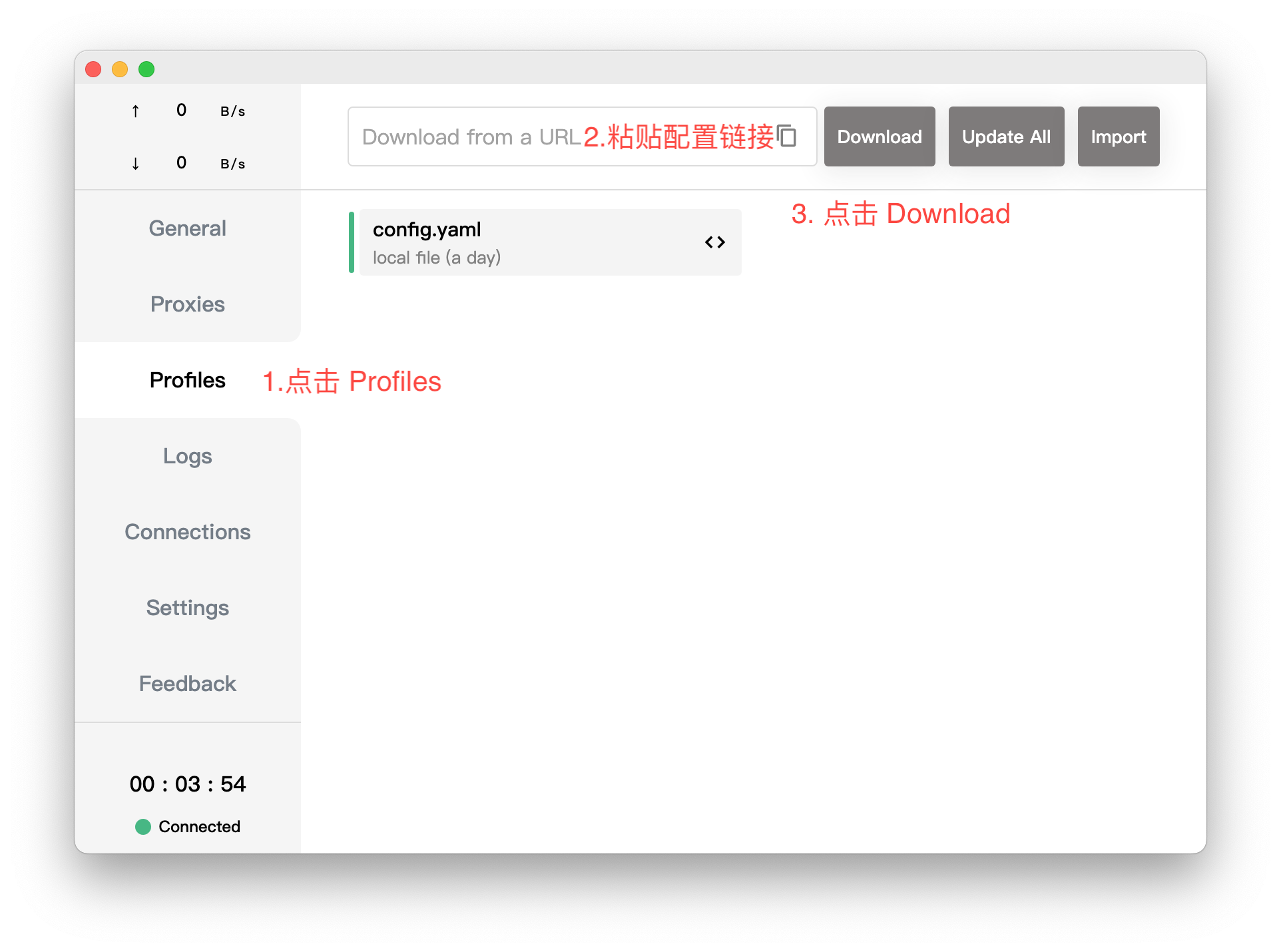 打开 Clash 应用,在左侧的标签页中选择 Profiles , 在顶部输入您的订阅链接,然后点击 Download 按钮。